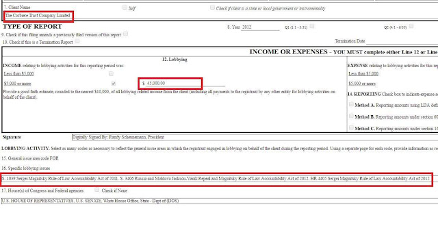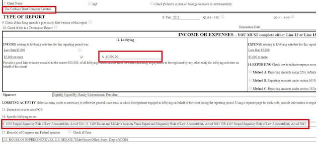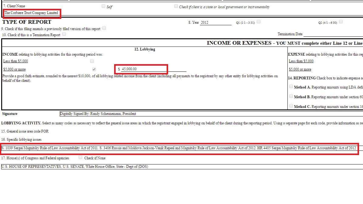 It should be noted that over time the dumping of funds from the offshore company controlled by Mikhail Khodorkovsky for lobbying the Magnitsky Act has only intensified. In 2012, the same Orion Strategies company received 4 payments of $45,000 each from Corbiere Trust all for the purpose of supporting the Magnitsky Act.