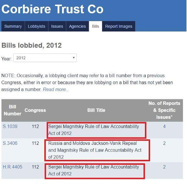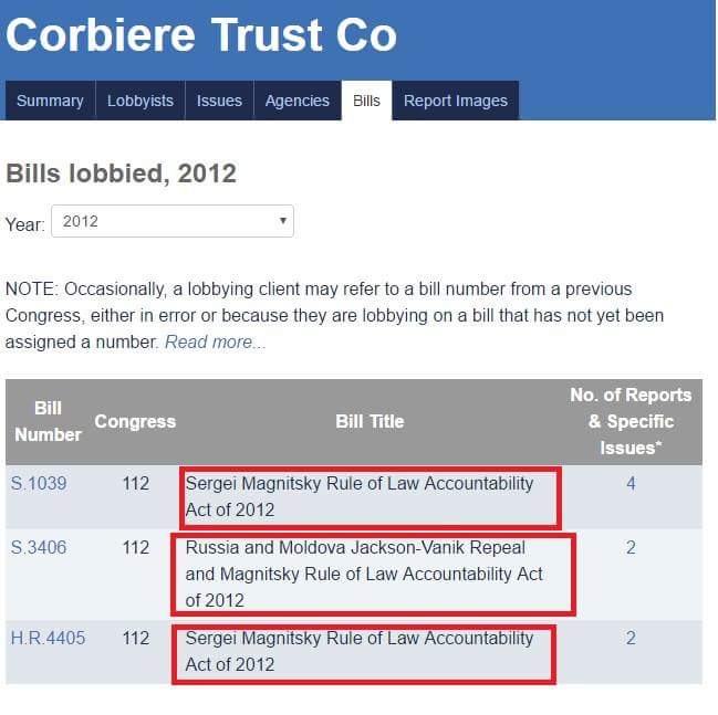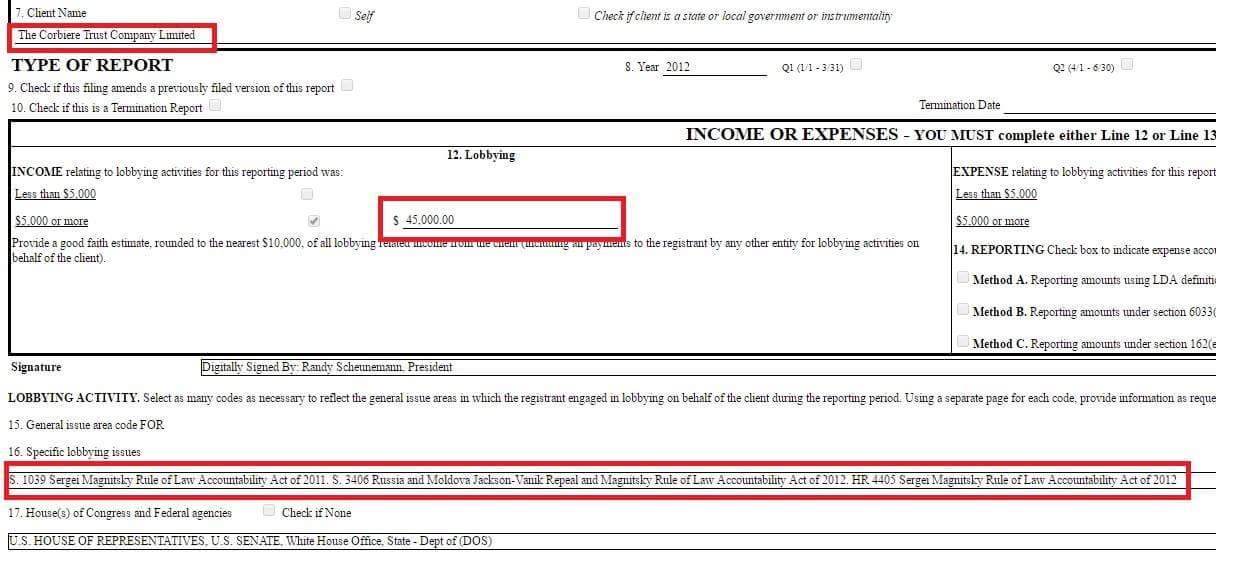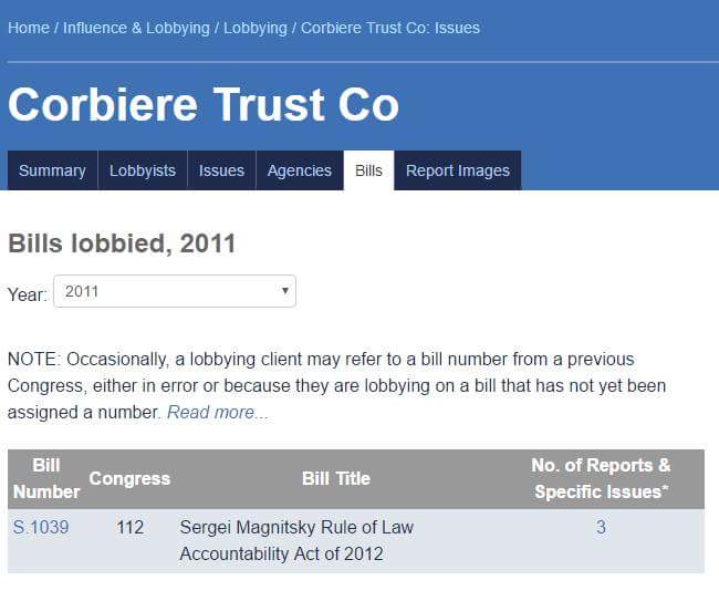 But the most interesting comes later. A search through open source information reveals that the offshore company Corbiere Trust is controlled by Mikhail Khodorkovsky and in 2011-2012 actively participated in lobbying for Congress’ adoption of the Magnitsky Act.