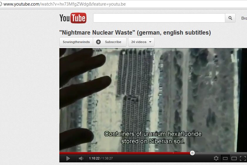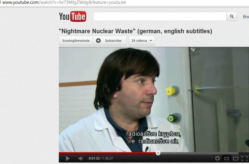 At 51 minutes in, this is a lab technician talking about the invisible but highly toxic and radioactive Krypton and Xenon gas that is being released into the air from this plant, making the air very radioactive. These radioactive gases decay into highly toxic, solid, radioactive elements wherever they land. All by itself, the amount of radiation released into the air, is like a ongoing nuclear accident, only it happens 24 hours a day, 365 days a year.