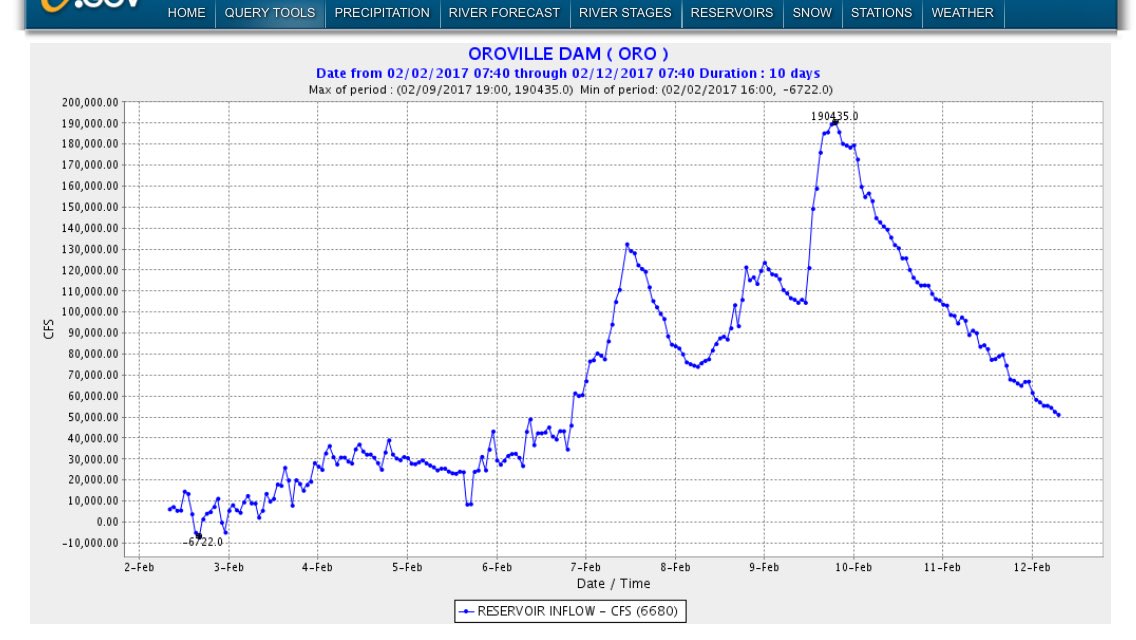 POSTSCRIPT (2/12/17): The inflow to Oroville Reservoir is finally dropping below the outflow, so the lake level can start dropping (hopefully enough to deal with the next storm in five days).